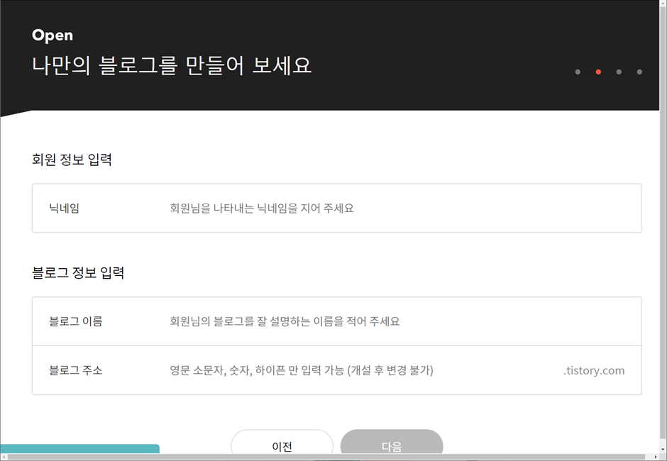 - 닉네임과 블로그 이름은 변경 가능하지만 한번 적은 블로그 주소는 바꿀 수 없으니 신중하게 작성해야 합니다.