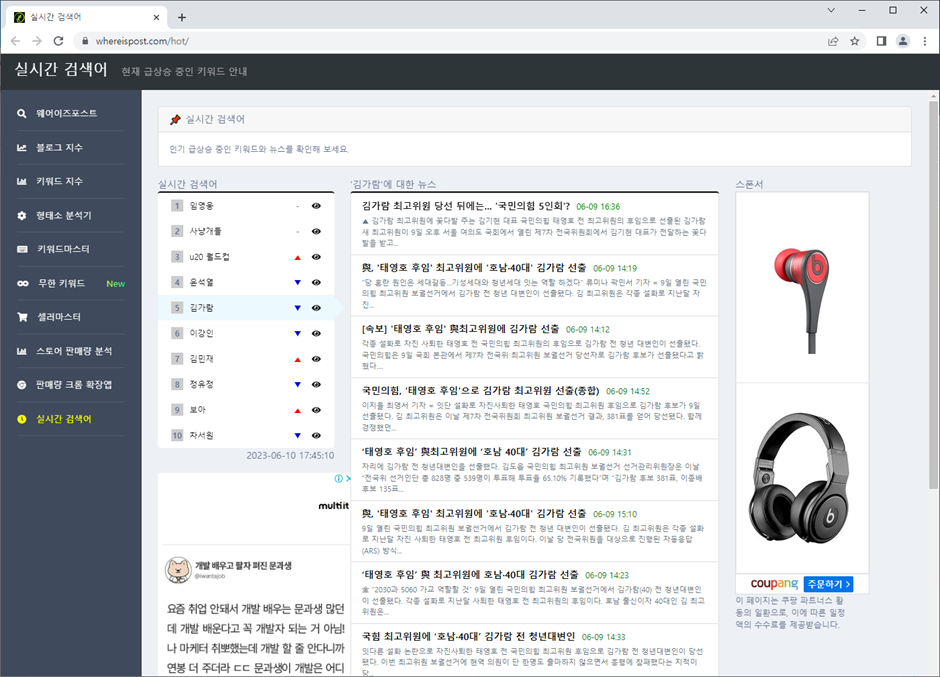 - 실시간 검색어, 블로그 지수, 키워드 지수, 형태소 분석기, 키워드 마스터 등 제공