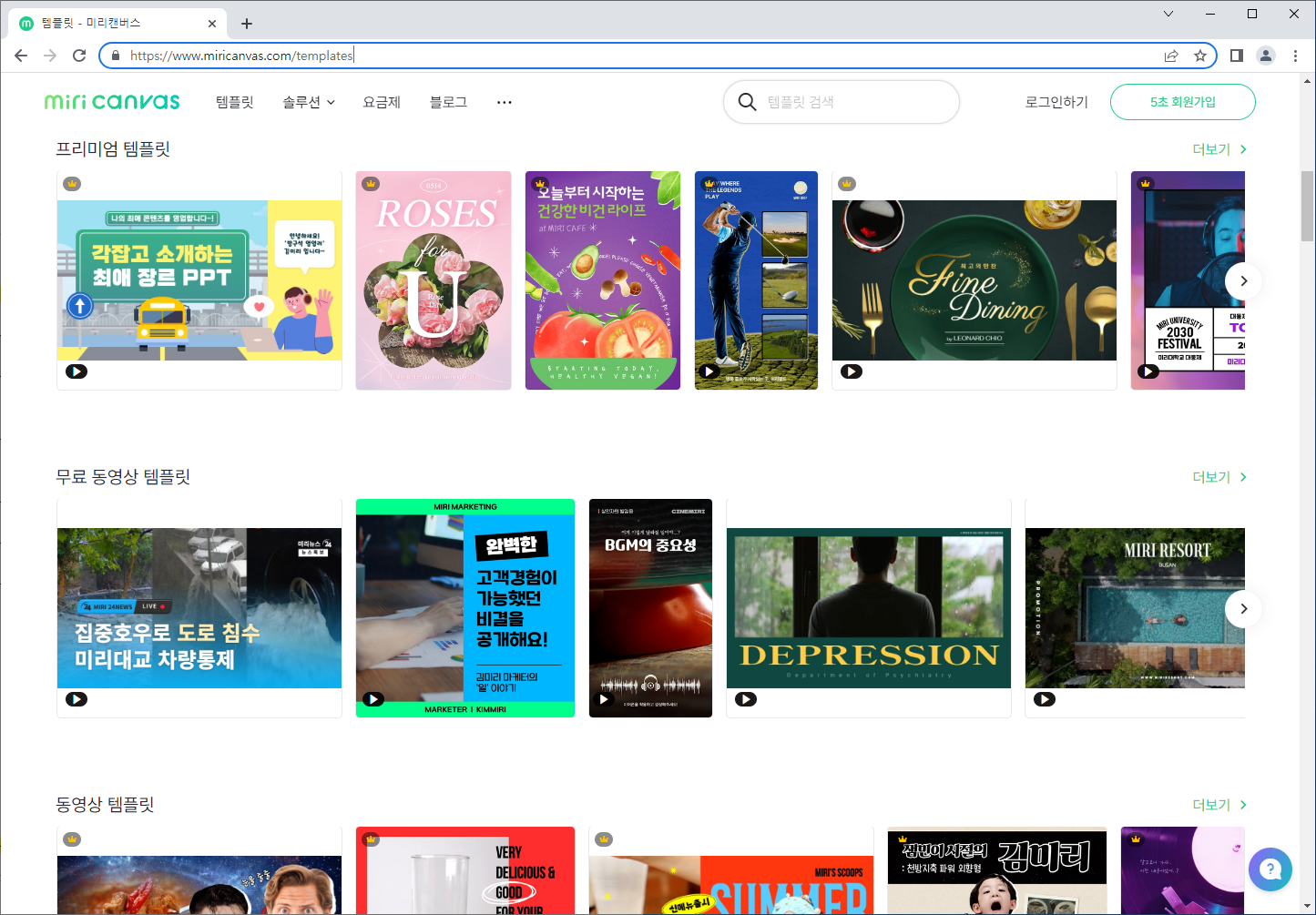 템플릿과 이미지 등을 제공하는 쉬운 디자인 동영상 툴 프로그램. 카드뉴스, 프레젠테이션, 상세페이지, 인포그래픽, 포스터, 배너 등 제작