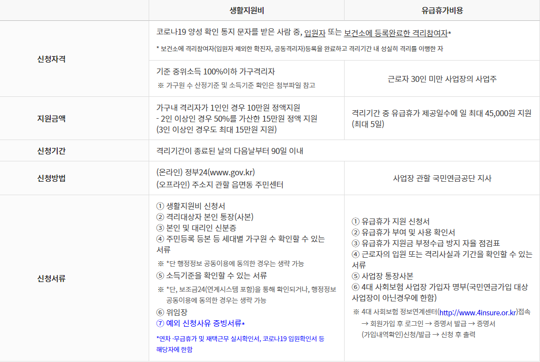 >> 입원 격리자 생활지원비 및 유급휴가비용 안내