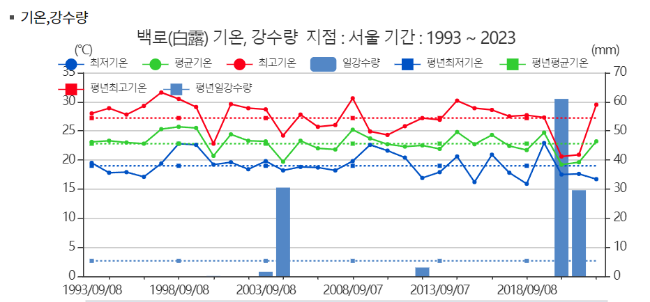 - 백로는 백로가 날아드는 시기로, 이때부터는 밤이 길어지고 아침저녁으로 서늘해집니다.