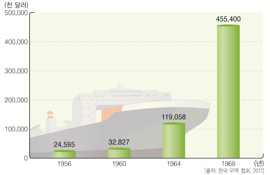 • 삼백산업을 거쳐 경공업으로 인해 통해 수출량이 크게 증가함